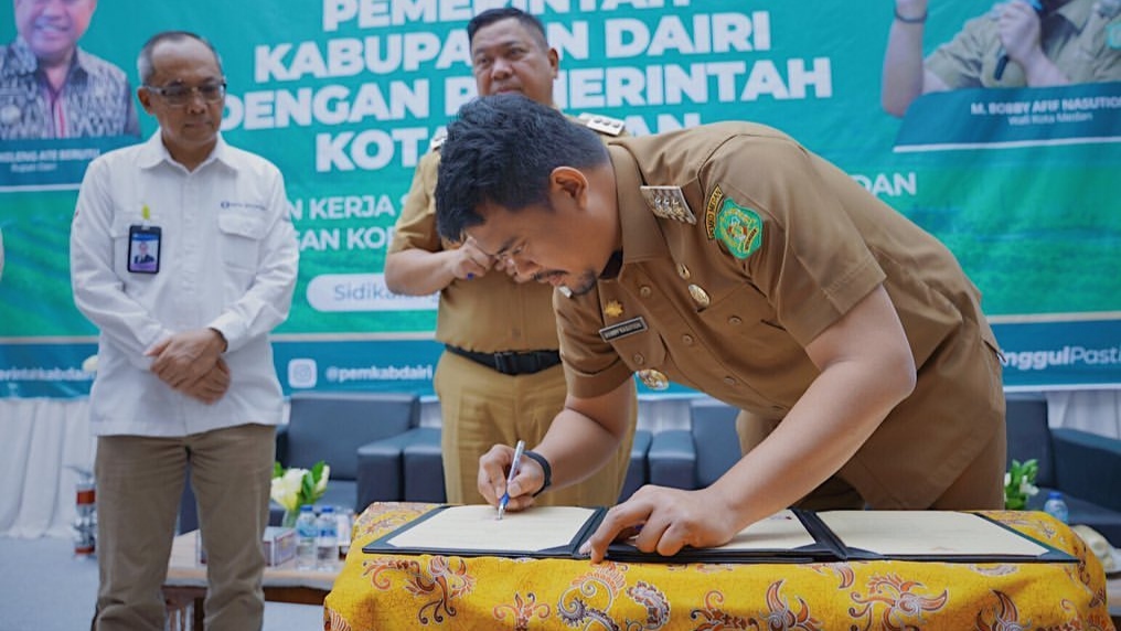 Penandatanganan MoU dilakukan Walikota Medan, Bobby Nasution bersama Bupati Dairi, Eddy Keleng Ate Berutu di Gedung Pusat Layanan Usaha Terpadu (PLUT) Koperasi dan UMKM, Jalan Olahraga, Kecamatan Sidikalang, Kabupaten Dairi, Senin (6/2/2023).