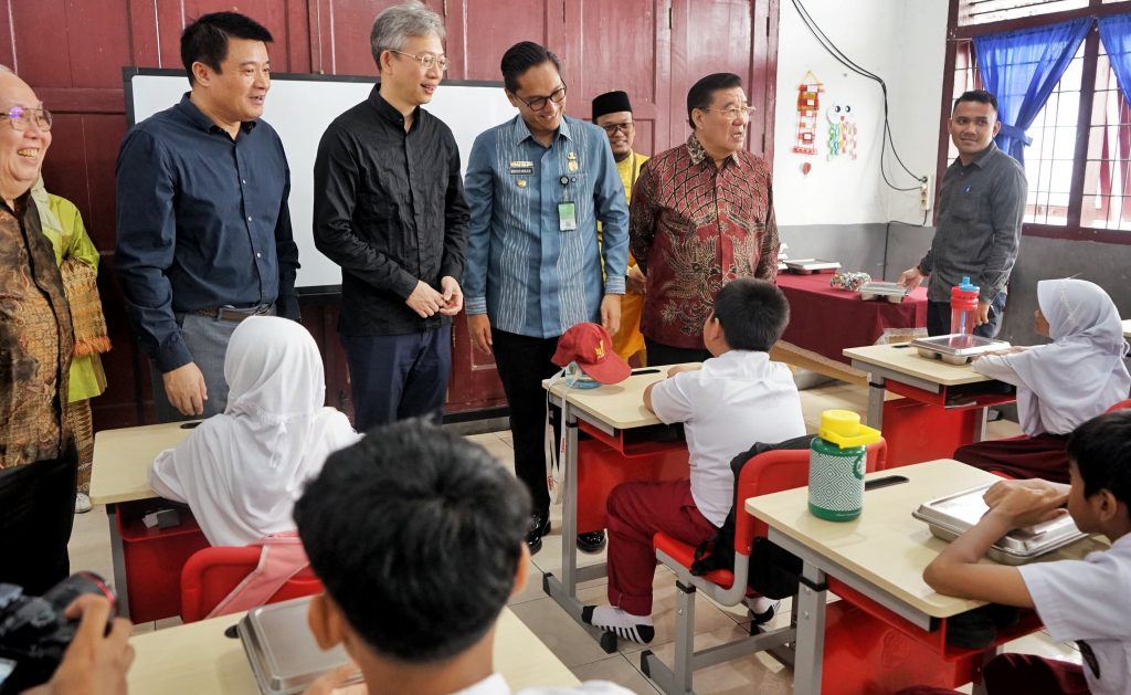 Walikota Medan Rico Waas bersama Duta Besar Tiongkok untuk Indonesia, Wang Lutong meninjau pelaksanaan program pemberian Makan Bergizi Gratis (MBG) kepada siswa SD Negeri 060812, Jumat (20/6/25) di jalan STM Medan. (axialnews)