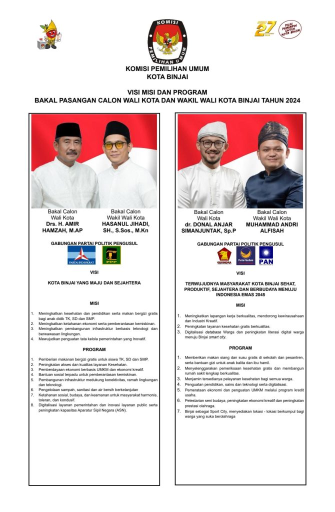 Berikut visi dan misi serta program dari masing-masing empat Paslon tersebut, sumber foto dari KPU Kota Binjai.