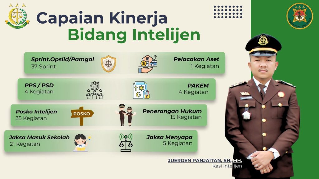 Bidang Intelijen melaksanakan 37 Surat Perintah Operasi Intelijen / Pengamanan / Penggalangan (Opslid/Pam/Gal). Selain itu, bidang ini menggelar empat kegiatan Pengamanan Pembangunan Strategis (PPS/PSD), satu kegiatan pelacakan aset, serta empat kegiatan Pengawasan Aliran Kepercayaan dan Keagamaan dalam Masyarakat (PAKEM).