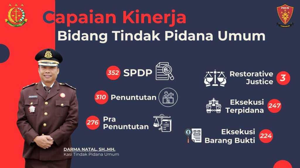 Bidang Tindak Pidana Umum menerima 352 Surat Pemberitahuan Dimulainya Penyidikan (SPDP). Jaksa menangani 310 perkara pada tahap penuntutan dan 276 perkara pada tahap pra-penuntutan.