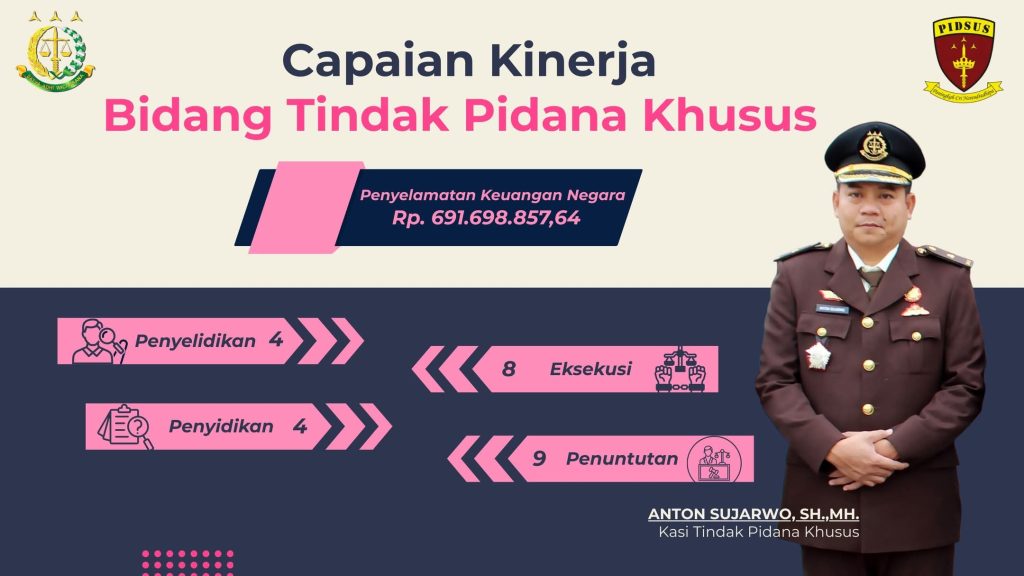 Bidang Tindak Pidana Khusus melakukan empat penyelidikan dan empat penyidikan perkara. Jaksa juga menangani 10 perkara pra-penuntutan, sembilan perkara penuntutan, serta melaksanakan delapan eksekusi. Dari penanganan tersebut, Kejaksaan berhasil menyelamatkan keuangan negara sebesar Rp 691.698.857,64.