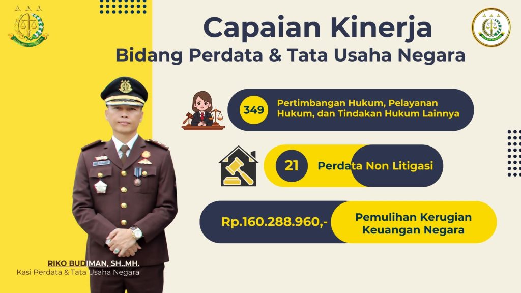 Bidang Perdata dan Tata Usaha Negara memberikan 349 layanan berupa pertimbangan hukum, pelayanan hukum, dan tindakan hukum lainnya. Selain itu, bidang ini menangani 21 perkara perdata nonlitigasi dan berhasil memulihkan kerugian keuangan negara sebesar Rp160.288.960.