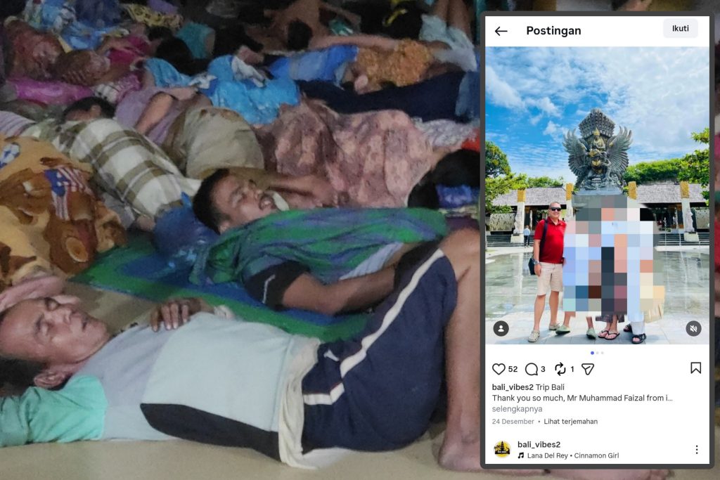 Teks Foto: Latar, puluhan warga terdampak banjir saat mengungsi di salah satu masjid di Pangkalan Brandan sejak Rabu malam (26/11) hingga Minggu malam (30/11). Depan: Screenshot akun instagram @bali_vibes2 upload foto liburan MF bersama keluarga yang diposting pada Rabu (24/12/25). (editan axialnews)
