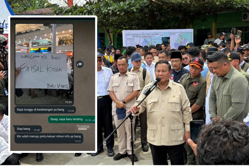 Teks Foto: Latar, Presiden Prabowo Subianto sambangi warga korban banjir, Sabtu (13/12/25) di posko pengungsian MAN 1 Langkat di Desa Pekubuan, Tanjung Pura, Langkat, Sumut. Depan: Screenshot medsos pribadi MF yang dikirim narasumber, perlihatkan lokasi dan momen liburan MF bersama keluarga di Bali diduga pada perpanjangan status tanggap darurat bencana di Langkat. (editan axialnews)