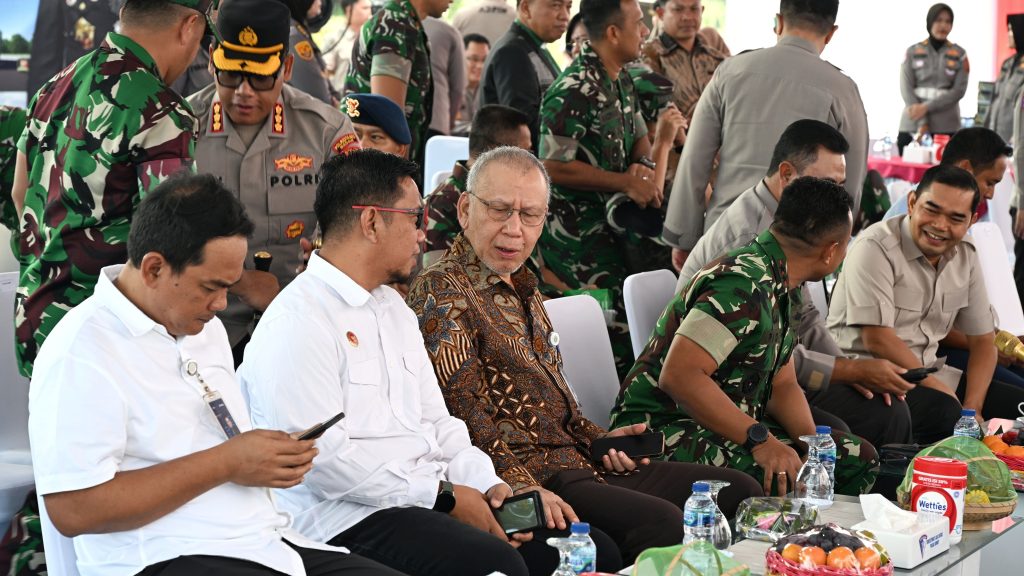 Sekdaprov Sumut Effendy Pohan bersama Kapolda Sumut Irjen Pol Whisnu Hermawan Februanto, Pangdam BB/I Mayjen Rio Firdianto, dan Wakil Ketua DPRD Sumut Ihwan Ritonga, mendengarkan arahan Presiden RI Prabowo Subianto.