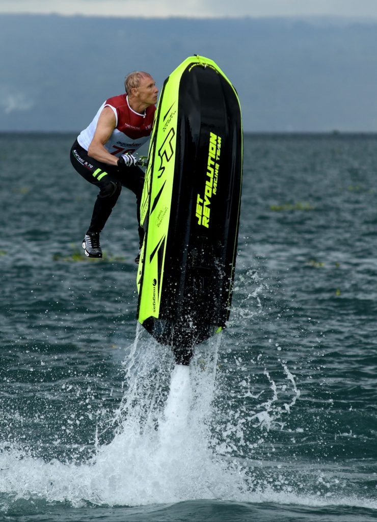 Roberto Mariani nomor punggung 70 saat beraksi di Venue utama kejuaraan Aquabike 2023, Balige, Minggu (26/11/23). Roberto Mariani berhasil menjadi juara dunia kategori freestyle. Saat konferensi pers, Freestyler asal Italia ini mengapresiasi dukungan dan antusias masyarakat untuk suksesnya acara Aquabike 2023. (axialnews)