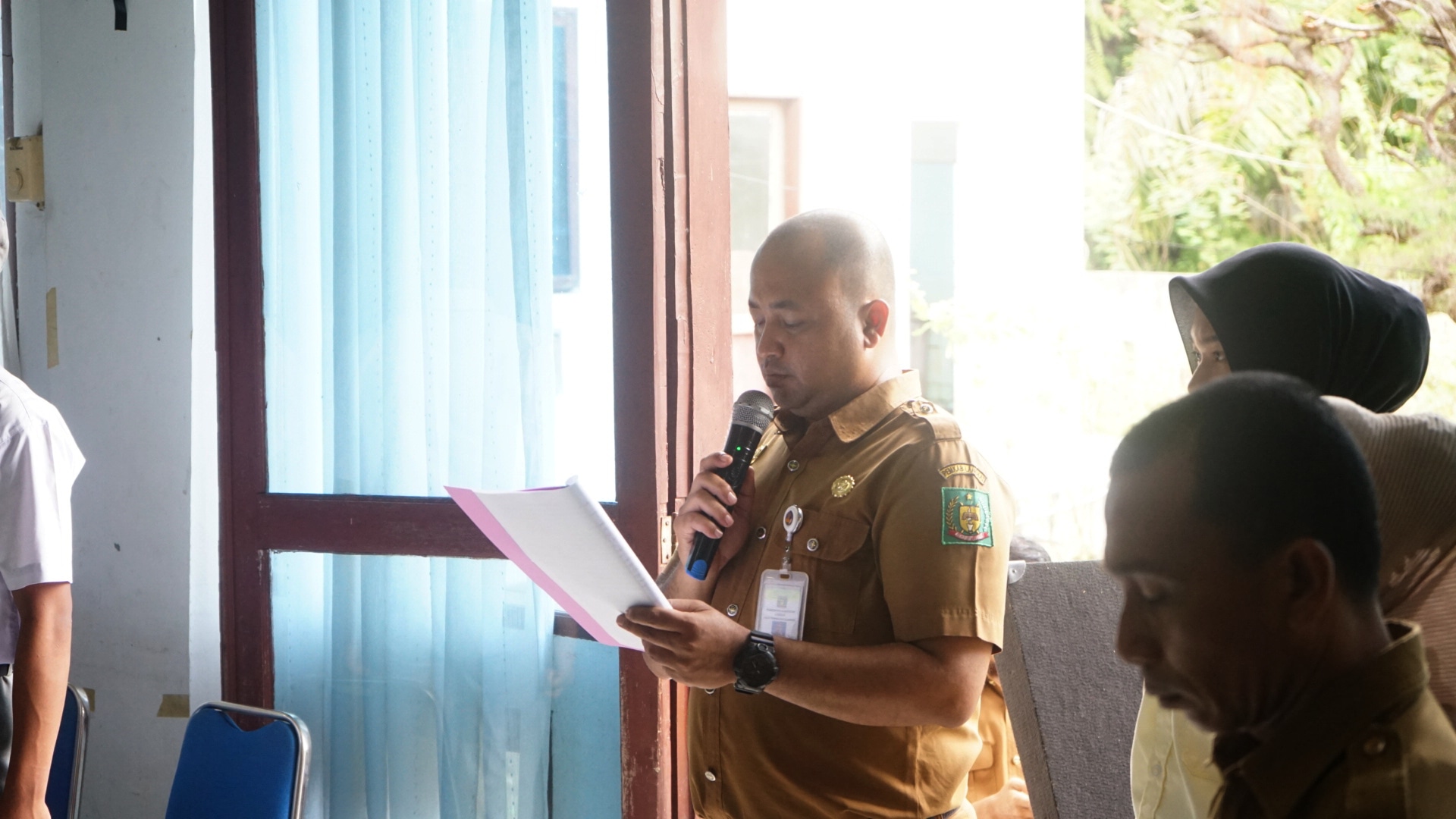 Kabid Bina Pemuda Dispora Langkat, H Ade Audia Helmi ST menyampaikan laporan panitia pembekalan dan pelatihan calon peserta anggota Paskibraka Kabupaten Langkat Tahun2022, di Gedung PKK Kabupaten Langkat, Stabat, Senin (1/8/2022). (Foto Diskominfo Langkat)