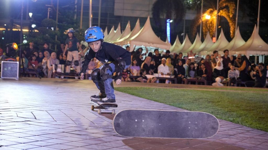 AXIALNEWS.id | Ajang Beranda Kreatif Medan, Sabtu (9/9/2023) malam di halaman depan kantor Walikota Medan diwarnai aksi olahraga skateboard. Di hadapan pengunjung, para skater (pemain skateboard) unjuk keterampilan bermain dengan papan luncurnya. Irama musik dan tataan cahaya yang apik kian menambah pesona atraksi itu.
