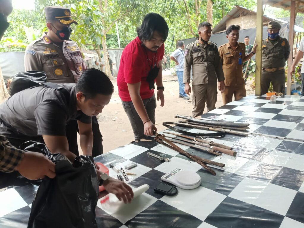 Petugas juga menemukan sejumlah barang bukti diantaranya timbangan dan alat konsumsi narkoba jenis sabu lainnya. Serta mendapati senjata tajam berupa kelewang, pisau serta senapan angin.