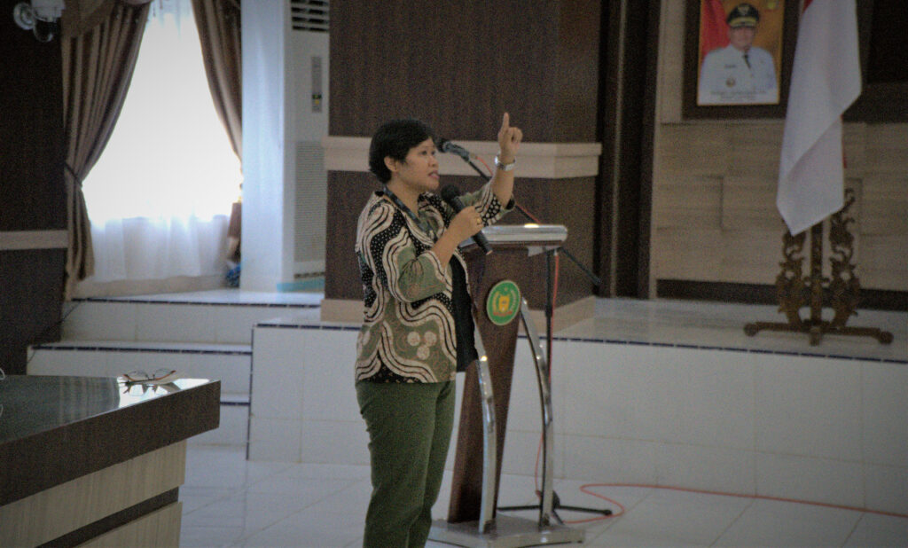 Program Manager Rutgers ID, Hastin Atas Asih memaparkan tujuan program RHRN2 secara spesifik kepada dinas terkait di jajaran Pemkab Langkat, Kantor Bupati Langkat, Stabat, Rabu (8/12/21).