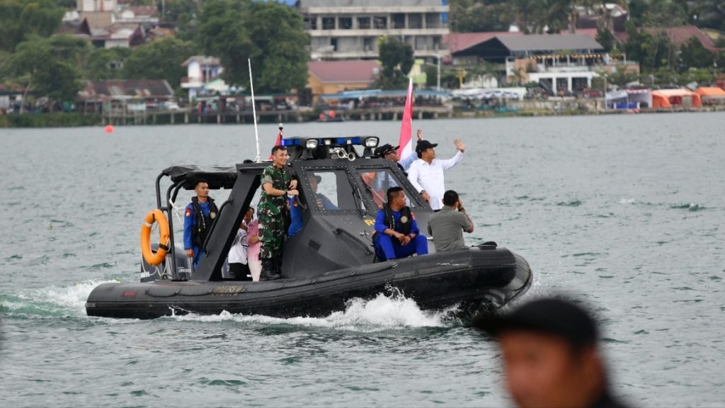 Pj Gubernur Sumut Hassanudin bersama Pangdam I/Bukit Barisan Mochammad Hasan menaiki boat saat melakukan parade pada penyelenggaraan Aquabike, Sabtu (25/11/23) di Pelabuhan Balige, Toba.