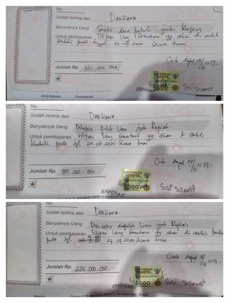 Termasuk beberapa lembaran kwitansi bukti investasi tambang emas bodong yang merugikan Darliana Br Sembiring hingga Rp1,130 miliar. (Sumber istimewa)