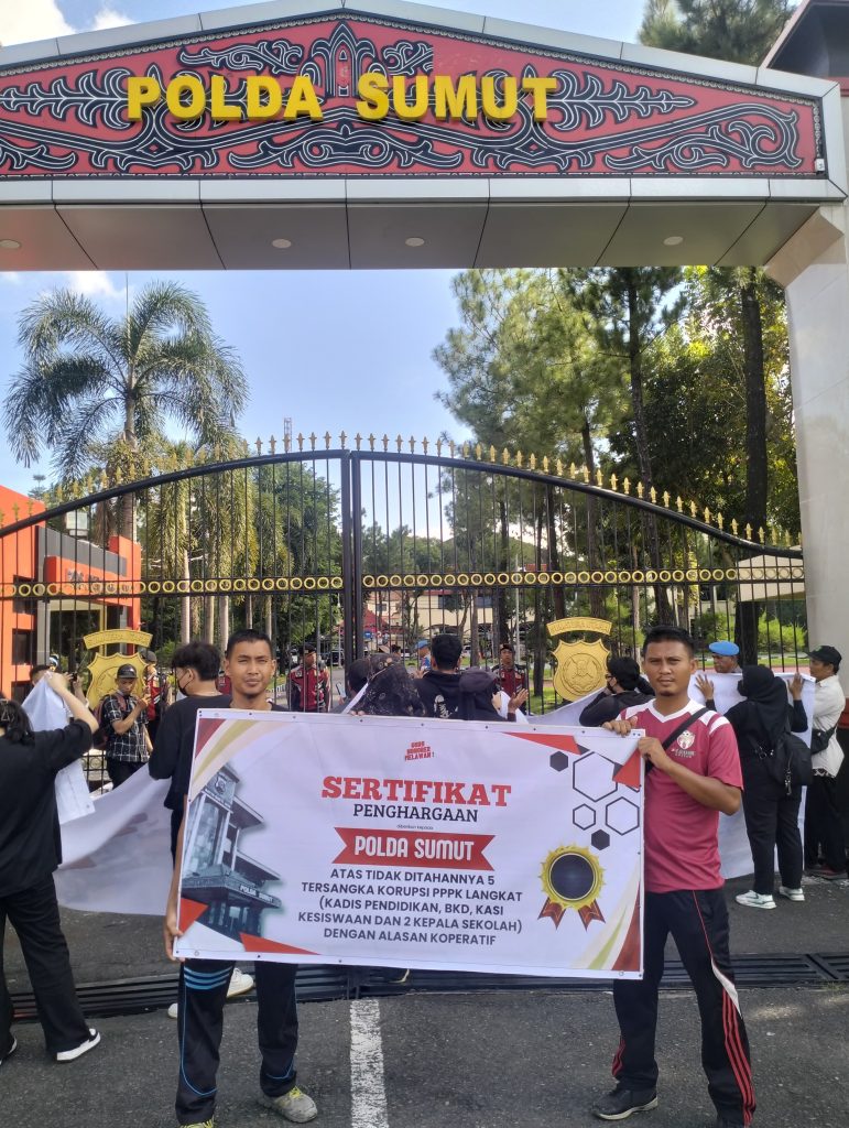 Para guru turut memberikan awards dalam aksinya kepada Polda Sumut sebagai polda terbaik, karena tidak melakukan penahanan terhadap 5 Tersangka Korupsi.