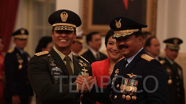 Jendral Andika saat menjabat Kepala Staf TNI AD, salam komando bersama Panglima TNI Marsekal Hadi Tjahjanto usai pelantikan di Istana Negara, Jakarta, Kamis, 22 November 2018.  Sumber TEMPO.co/Amston Probel